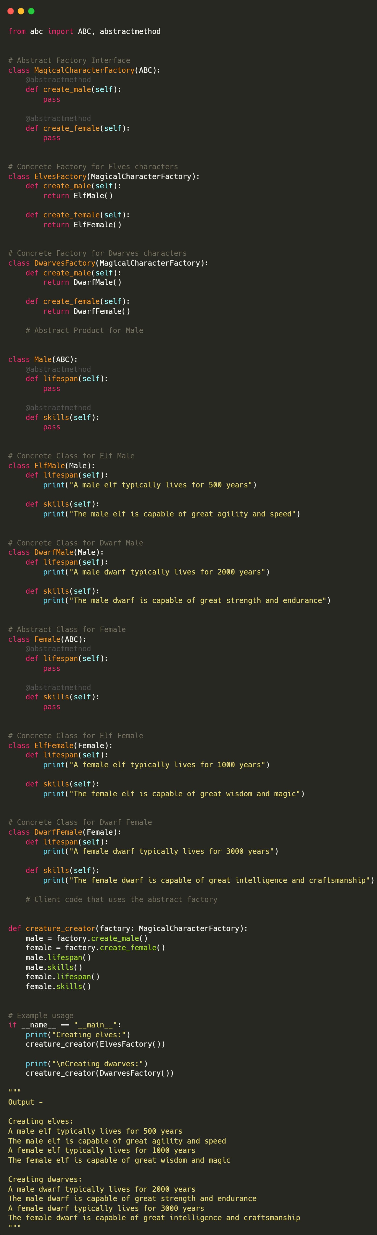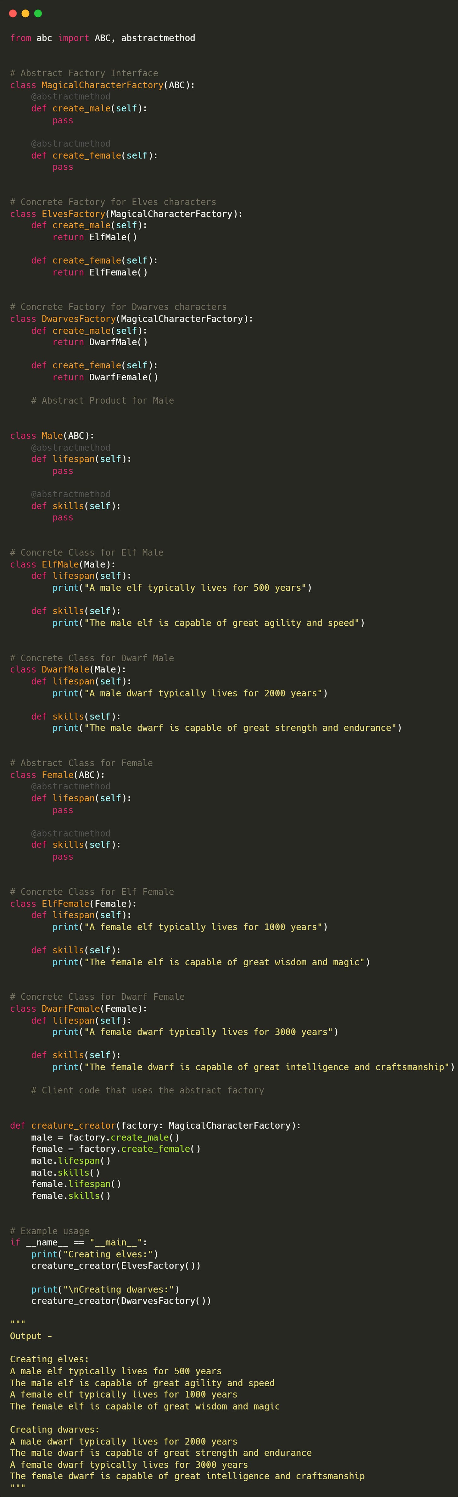 Now each magical character creation can involve the creation of a male character and a female character i.e. The MagicalCharacterFactory has two abstract methods called - create_male() and create_female()