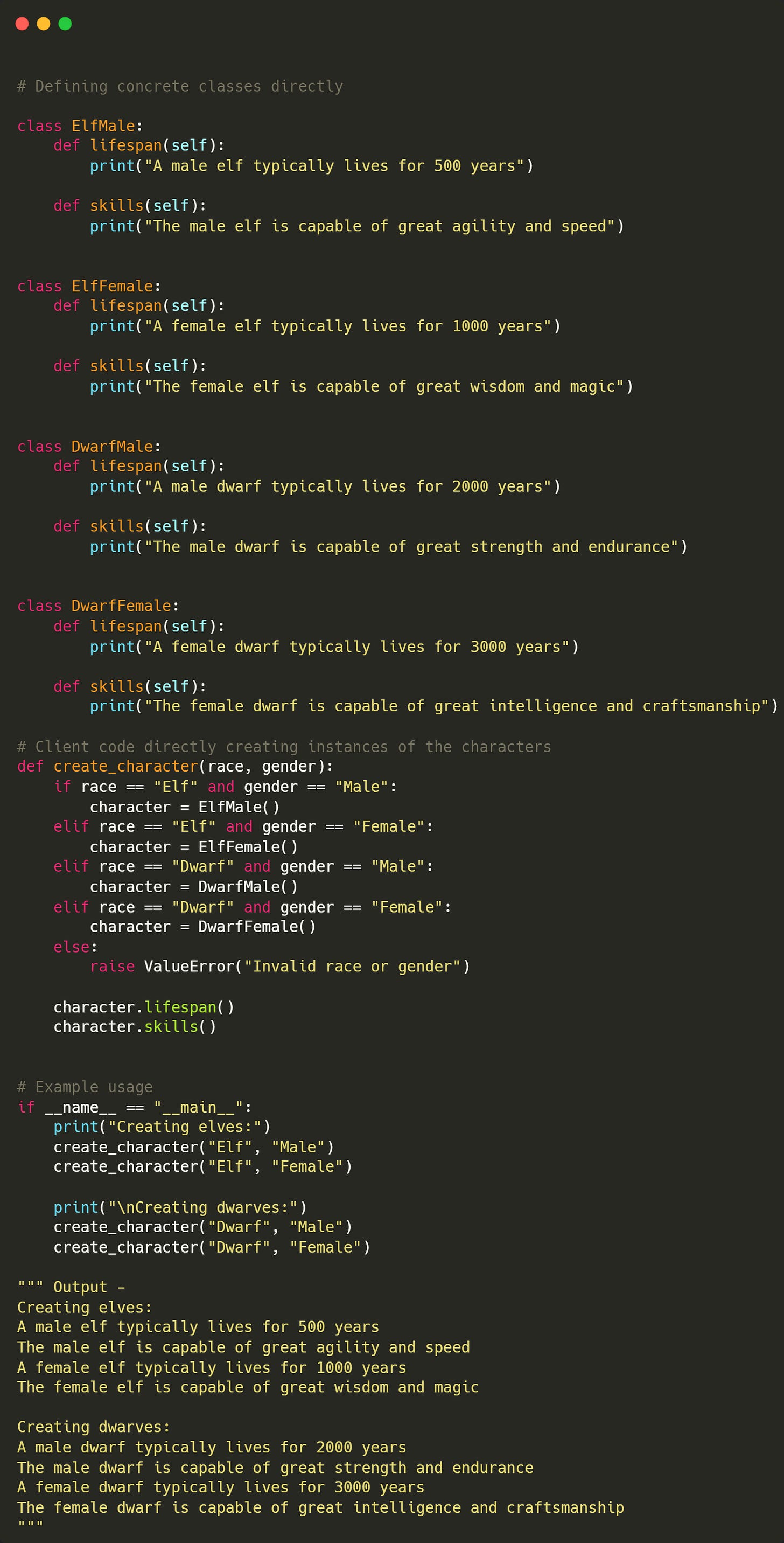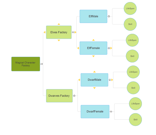 What I've done here is expect that each Character Factory i.e. ElvesFactory/DwarvesFactory will create one Male and one Female of their species as evidenced by the parent (base) Interface.