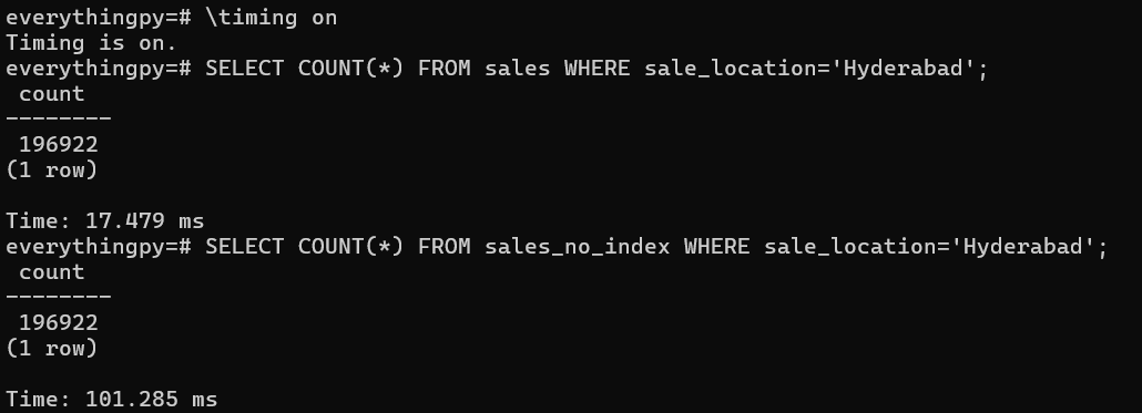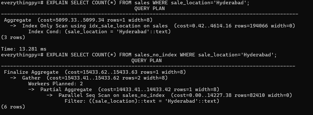 When we ask for the 2 SELECT statements to be EXPLAIN-ed, we can see that the first statement explicitly uses the idx_sale_location Index to fetch rows with sale_location=’Hyderabad’ whereas the second statement executes a Parallel Sequential Scan which takes more time.