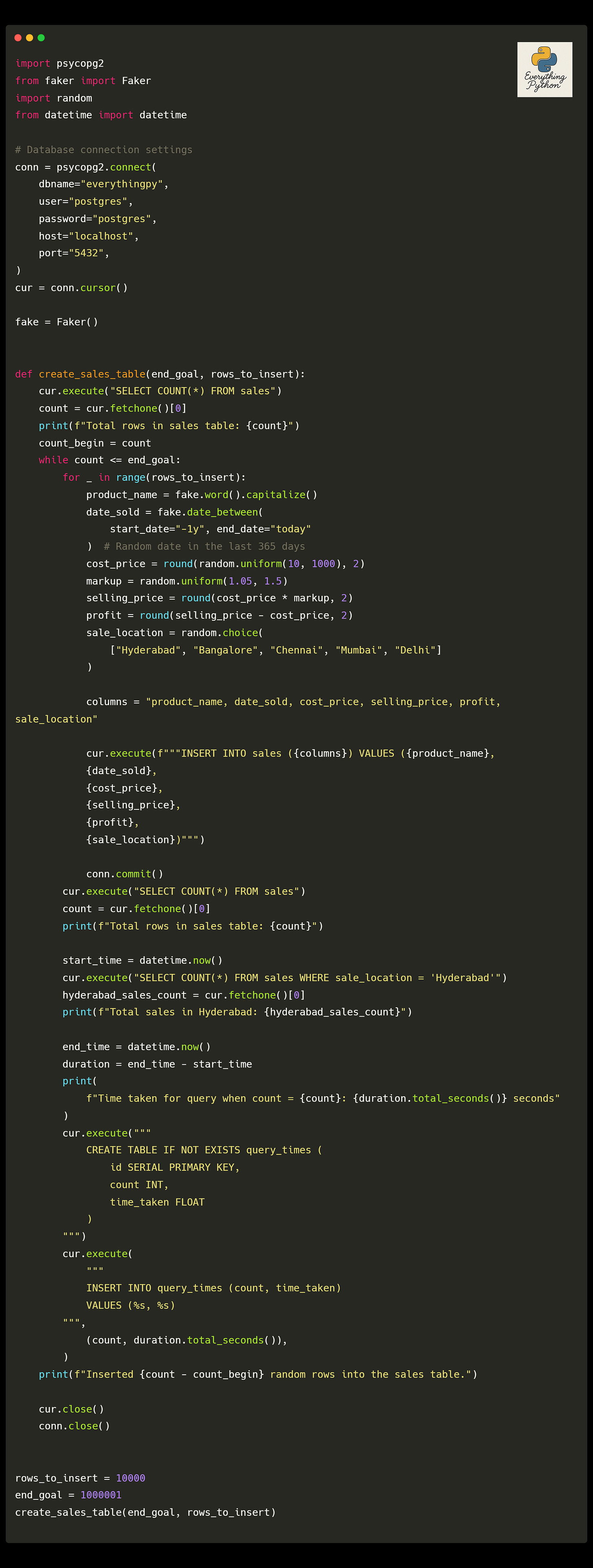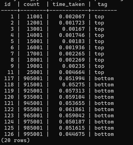 Now, what I’ve done is written up a code snippet to keep adding 100 rows at a time upto a certain number of rows I want to have in the ‘sales’ table and for every 100 rows, perform the fetch operation and measure the time taken to monitor the increase in time .