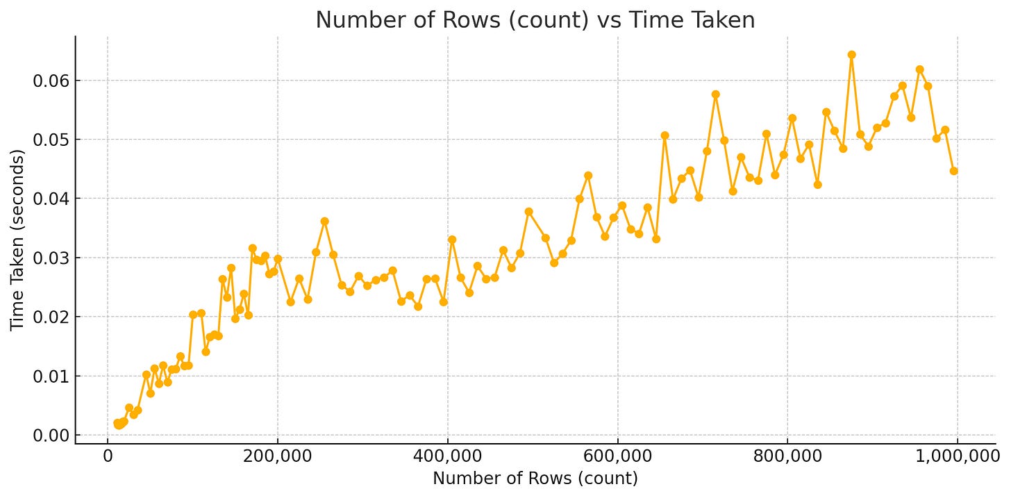 So the time taken is steadily growing with the number of rows being added in the dataset as expected.