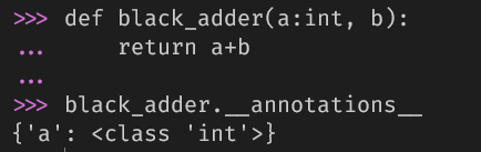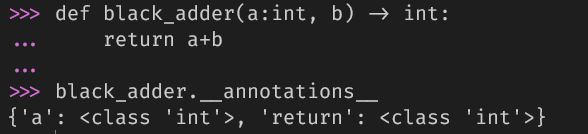 So, when we provide a type hint to one/more of the parameters, the __annotations__ dictionary starts coming to life. Here in particular, the parameter ‘a’ is populated in the __annotations__ dictionary with its hinted type i.e. int.